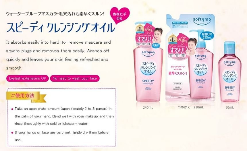 Cleansing oil removes makeup, including stubborn mascara, as well as dead skin cells and excess dirt, without leaving any oily residue. Gentle formula suitable for dry skin brightens and thoroughly cleanses, making double-cleansing unnecessary. Made with five types of oil including olive oil, jojoba oil, sesame oil, safflower oil and shea butter to keep skin moisturized.